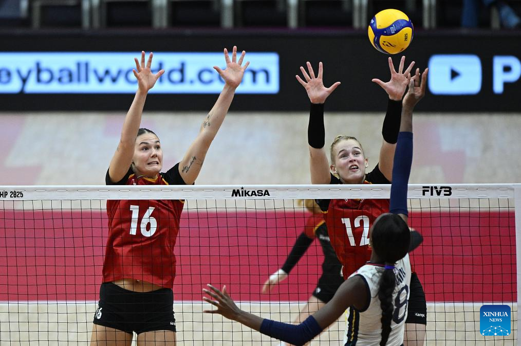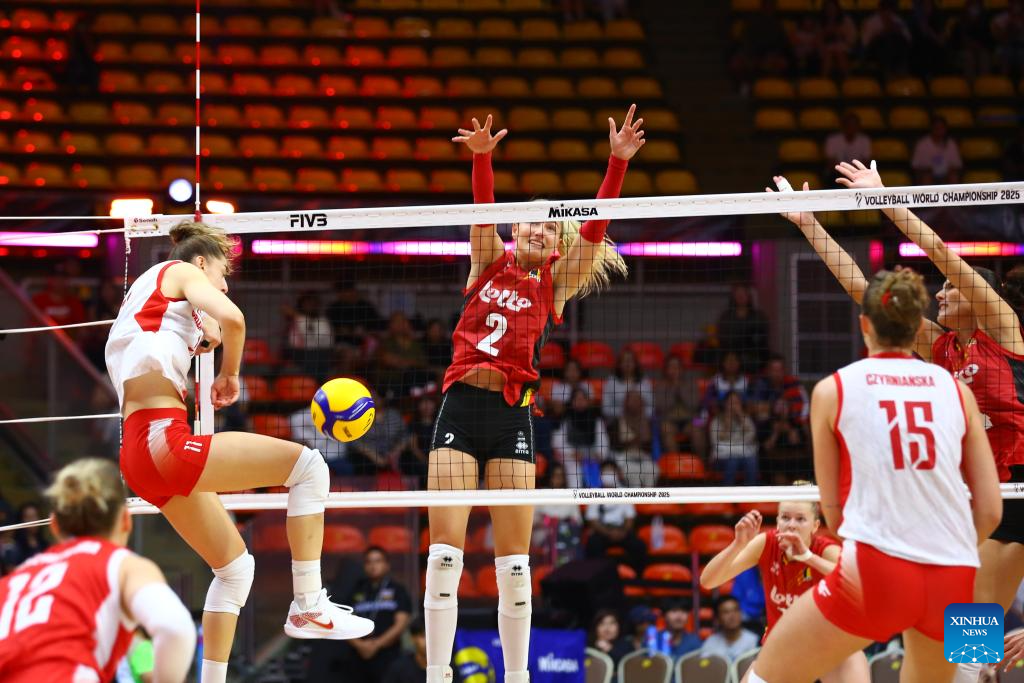 Britt Herbots (1st R) of Belgium competes during the round of 16 match between Poland and Belgium at the Volleyball Women's World Championship in Bangkok, Thailand, Aug. 30, 2025. (Xinhua/Sun Weitong)