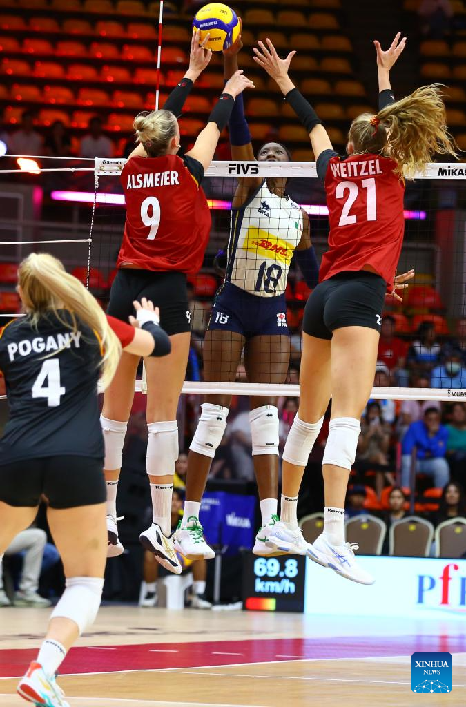 Paola Ogechi Egonu (Top C) of Italy spikes the ball during the round of 16 match between Italy and Germany at the Volleyball Women's World Championship in Bangkok, Thailand, Aug. 30, 2025. (Xinhua/Sun Weitong)