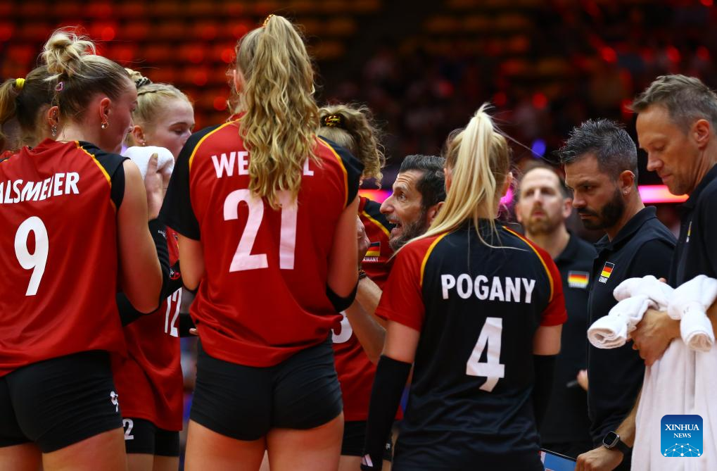 Giulio Cesare Bregoli (C), head coach of Germany, reacts during the round of 16 match between Italy and Germany at the Volleyball Women's World Championship in Bangkok, Thailand, Aug. 30, 2025. (Xinhua/Sun Weitong)
