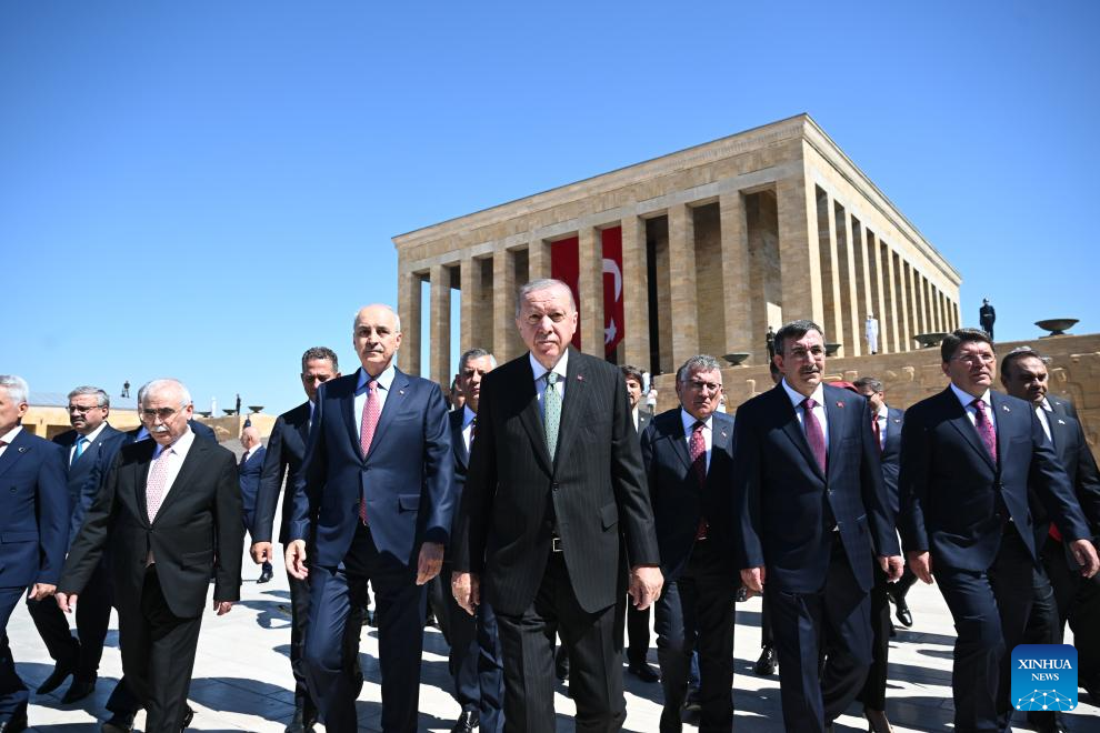 Turkish President Recep Tayyip Erdogan attends a ceremony marking Aug. 30 Victory Day at the Ataturk Mausoleum in Ankara, Türkiye, on Aug. 30, 2025. (Mustafa Kaya/Handout via Xinhua)
