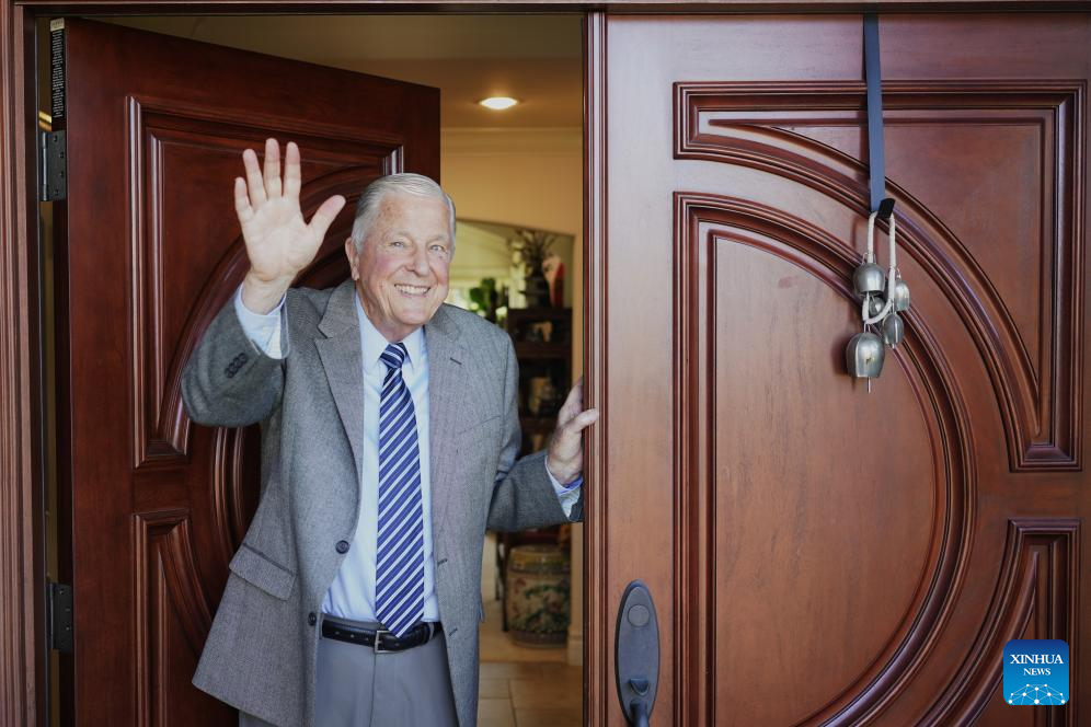 Stilwell's grandson John Easterbrook waves goodbye to the reporter in Saratoga of San Francisco Bay Area, the United States, on Aug. 11, 2025.(Xinhua/Wu Xiaoling)