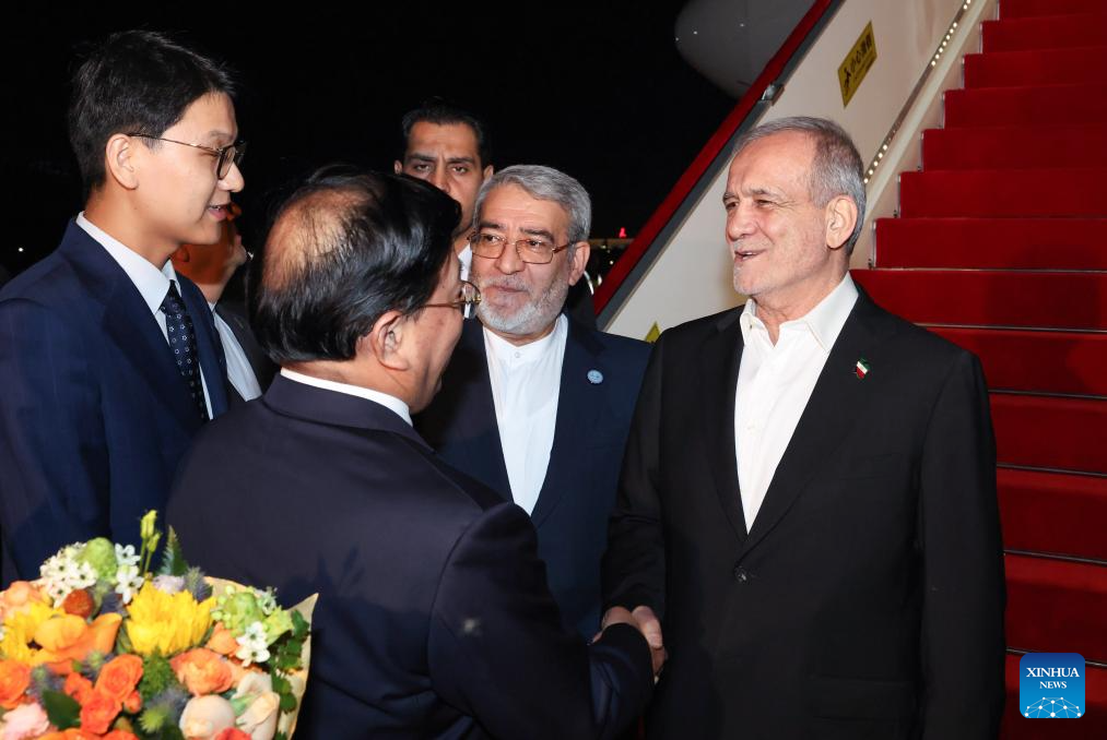 Iran's President Masoud Pezeshkian arrives for the Shanghai Cooperation Organization (SCO) Summit 2025 in Tianjin, north China, Aug. 31, 2025. (Xinhua/Huang Bohan)