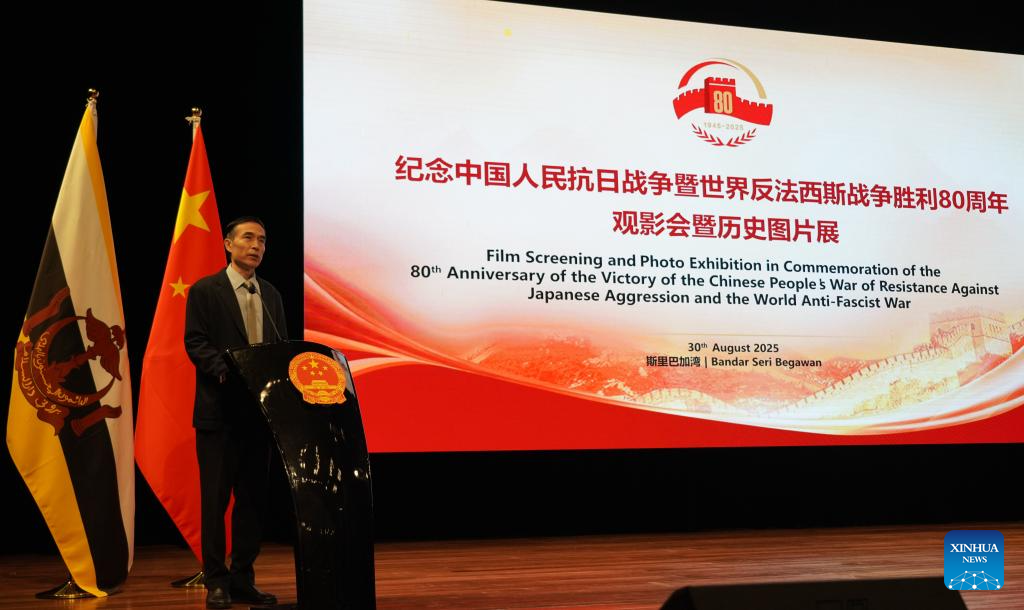 Chinese Ambassador to Brunei Xiao Jianguo speaks at a film screening and photo exhibition in commemoration of the 80th anniversary of the victory of the Chinese People's War of Resistance Against Japanese Aggression and the World Anti-Fascist War in Bandar Seri Begawan, Brunei, Aug. 30, 2025. The event was held here on Saturday, attracting over 200 participants. (Chinese Embassy in Brunei/Handout via Xinhua)