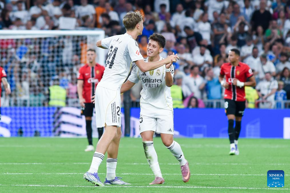 Arda Guler (R) of Real Madrid celebrates his goal with Dean Huijsen during the La Liga football match between Real Madrid and RCD Mallorca in Madrid, Spain, on Aug. 30, 2025. (Photo by Gustavo Valiente/Xinhua)