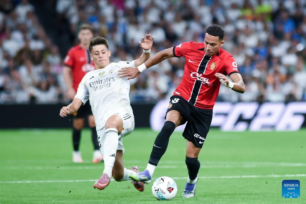 Arda Guler (L) of Real Madrid vies with Mateo Joseph of RCD Mallorca during the La Liga football match between Real Madrid and RCD Mallorca in Madrid, Spain, on Aug. 30, 2025. (Photo by Gustavo Valiente/Xinhua)