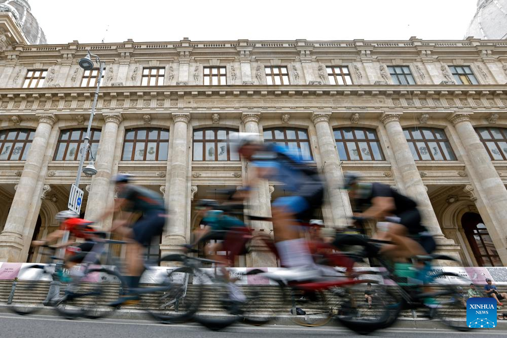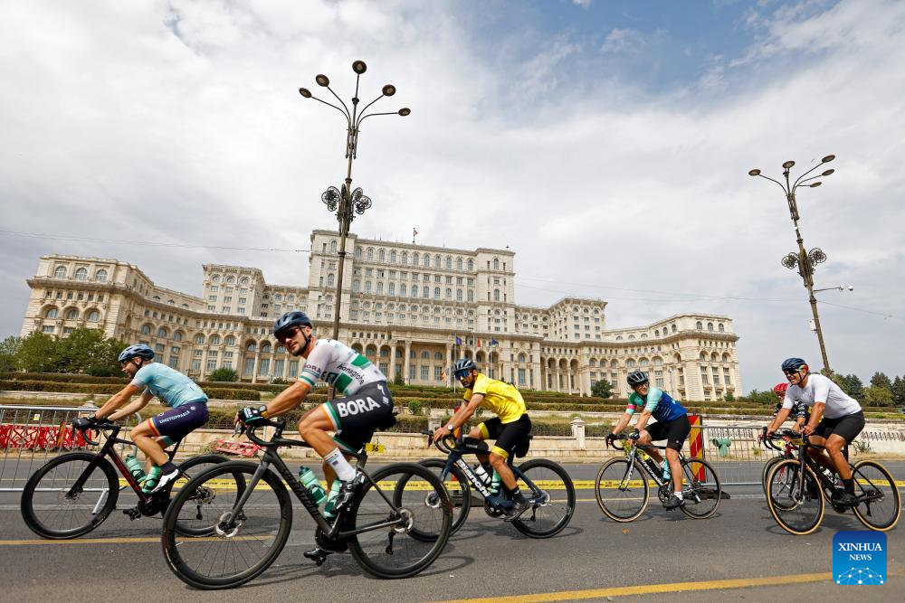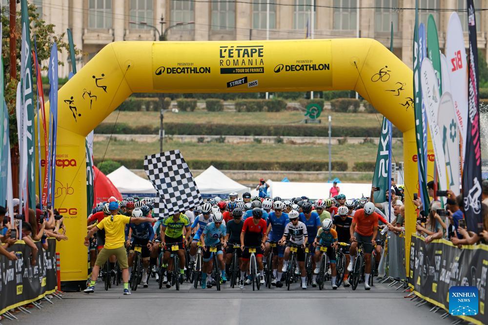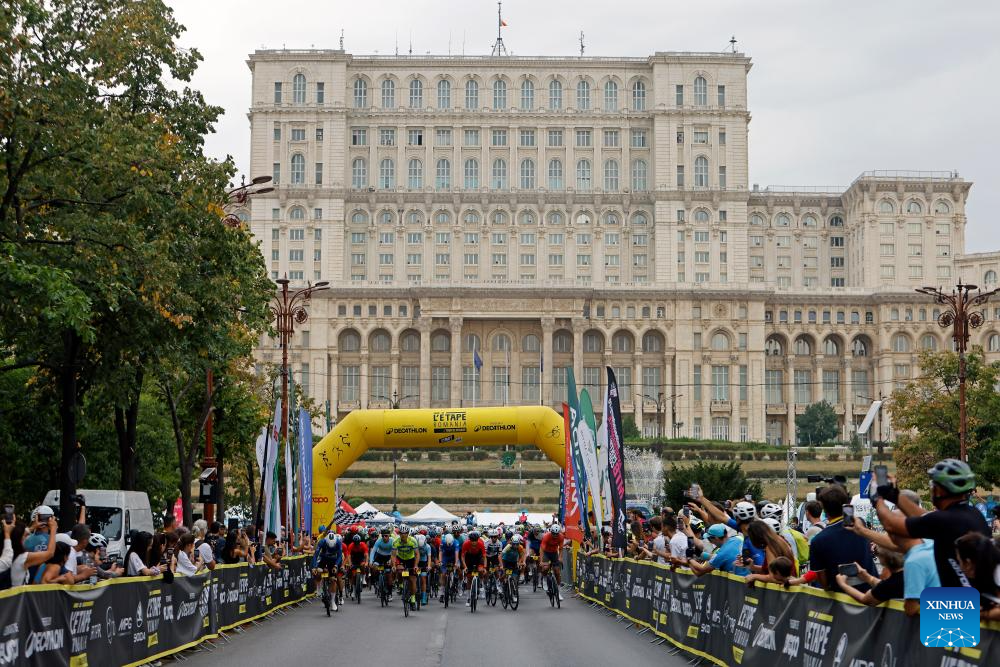 Cyclists start in front of the Parliament Palace during the L'Etape Romania by Tour de France cycling race in Bucharest, Romania, Aug. 31, 2025. (Photo by Cristian Cristel/Xinhua)