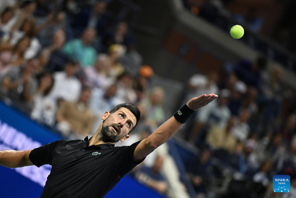 Novak Djokovic of Serbia serves during the men's singles fourth round match against Jan-Lennard Struff of Germany at the 2025 US Open tennis championships in New York, the United States, Aug. 31, 2025. (Xinhua/Li Rui)