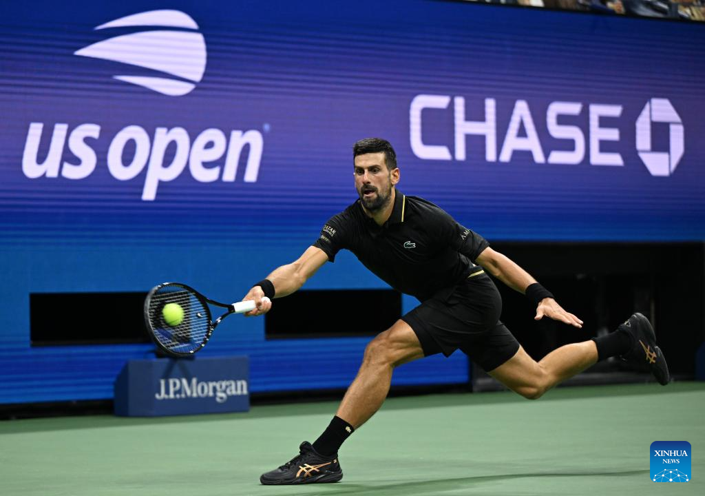Novak Djokovic of Serbia hits a reuturn during the men's singles fourth round match against Jan-Lennard Struff of Germany at the 2025 US Open tennis championships in New York, the United States, Aug. 31, 2025. (Xinhua/Li Rui)