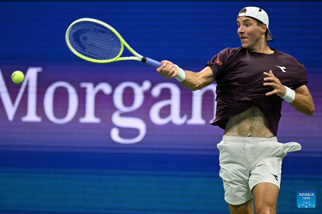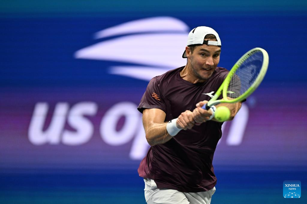 Jan-Lennard Struff of Germany hits a reuturn during the men's singles fourth round match against Novak Djokovic of Serbia at the 2025 US Open tennis championships in New York, the United States, Aug. 31, 2025. (Xinhua/Li Rui)
