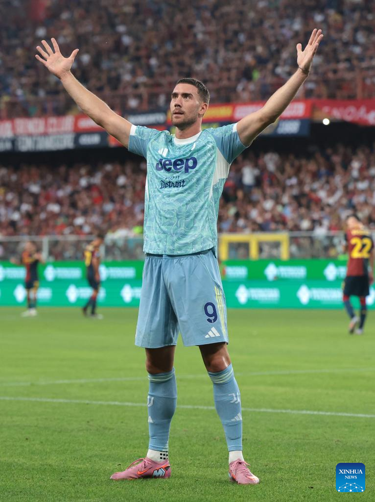 Juventus' Dusan Vlahovic celebrates his goal during a Serie A soccer match between Genoa and Juventus in Genova, Italy, Aug. 31, 2025. (Xinhua)