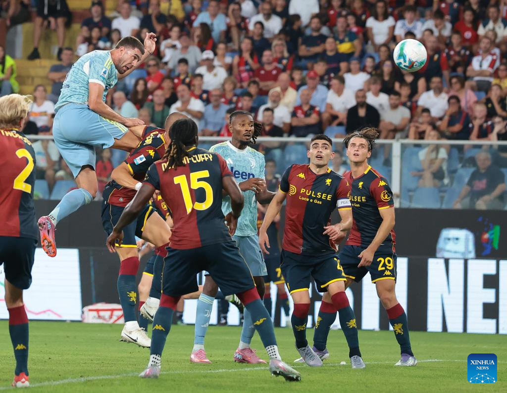 Juventus' Dusan Vlahovic (Top) scores during a Serie A soccer match between Genoa and Juventus in Genova, Italy, Aug. 31, 2025. (Xinhua)