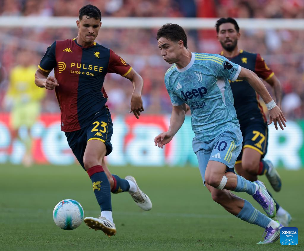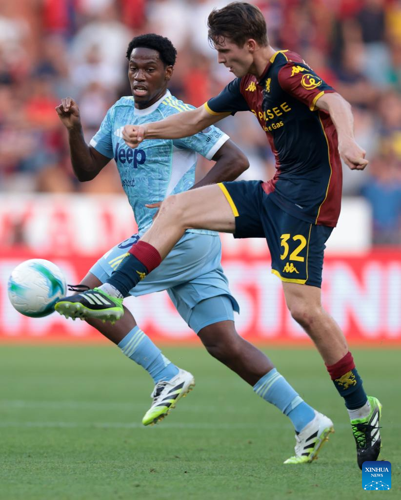 Juventus' Kenan Yildiz (R) vies with Genoa's Valentin Carboni during a Serie A soccer match between Genoa and Juventus in Genova, Italy, Aug. 31, 2025. (Xinhua)