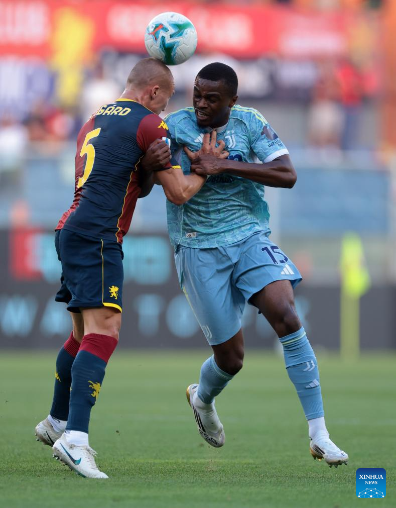 Juventus' Pierre Kalulu (R) vies with Genoa's Leo Ostegard during a Serie A soccer match between Genoa and Juventus in Genova, Italy, Aug. 31, 2025. (Xinhua)