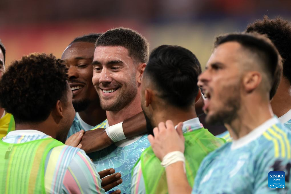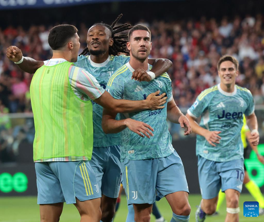 Juventus' Dusan Vlahovic (3rd L) celebrates his goal with his teammates during a Serie A soccer match between Genoa and Juventus in Genova, Italy, Aug. 31, 2025. (Xinhua)