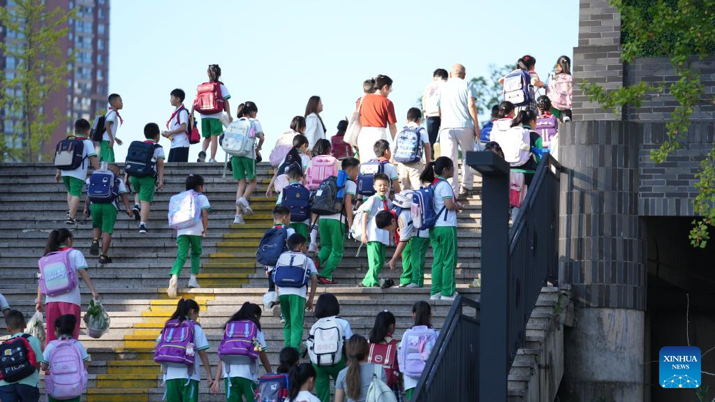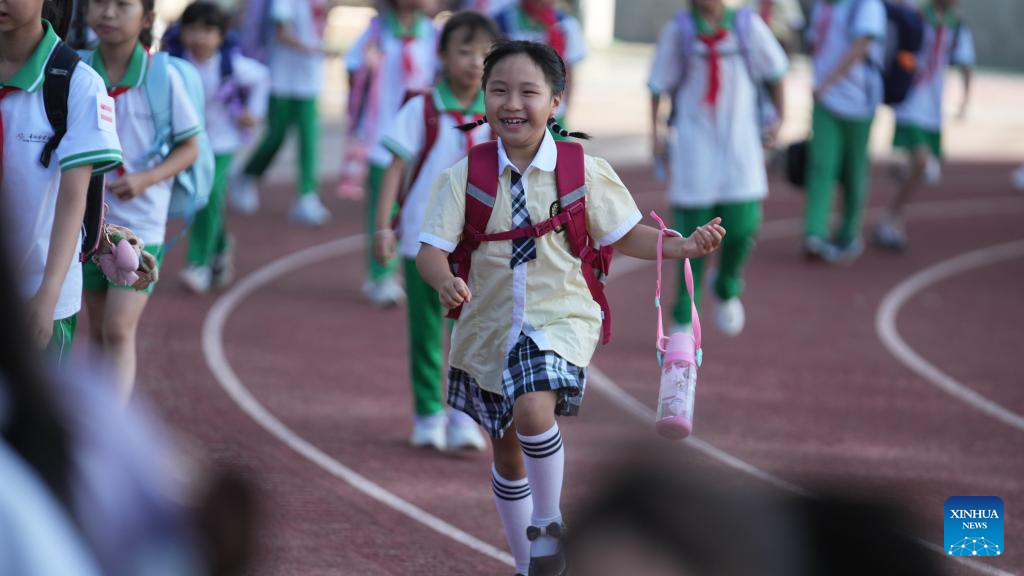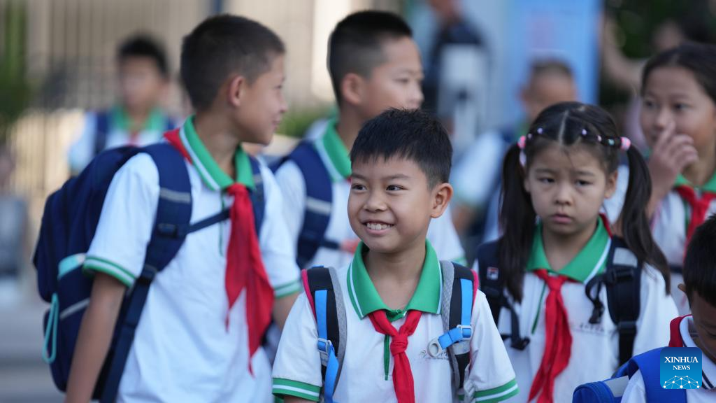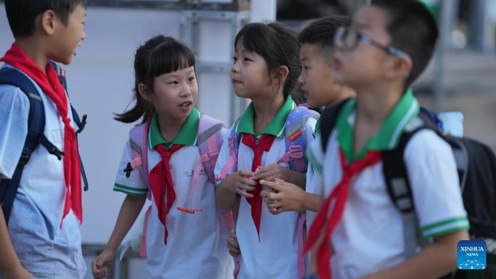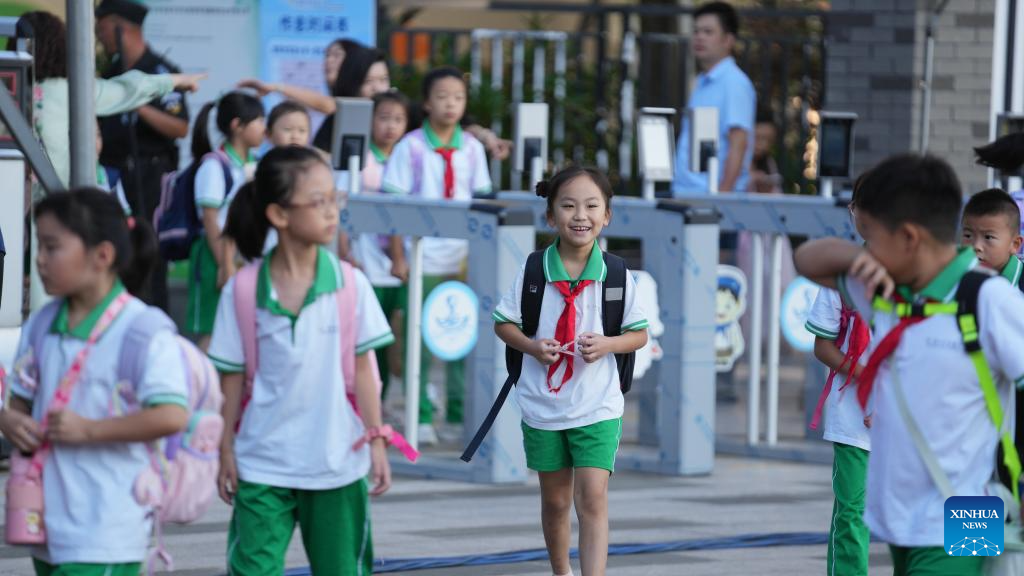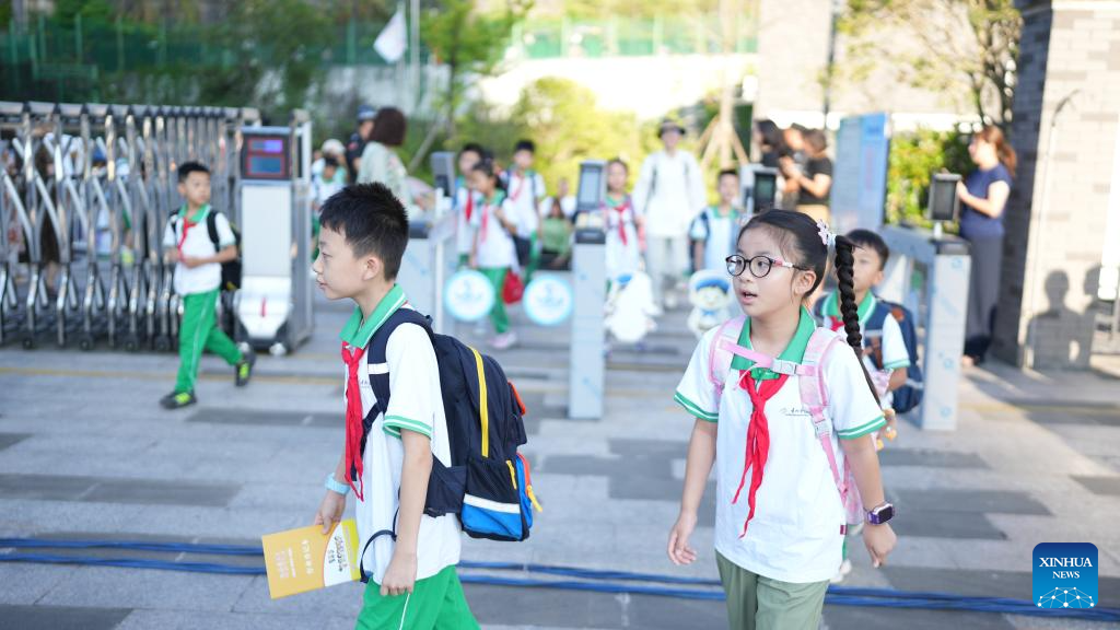 Students arrive at a primary school in Guiyang, southwest China's Guizhou Province, Sept. 1, 2025. The new semester for primary and secondary schools kicked off in many parts of China on Monday. (Xinhua/Tao Liang)
