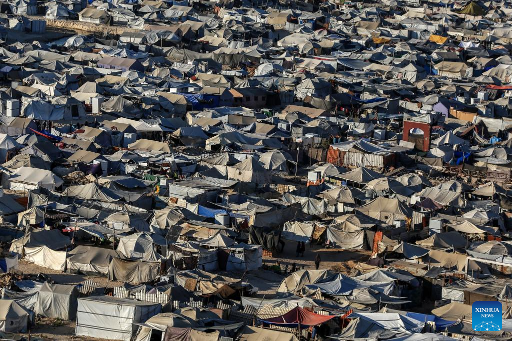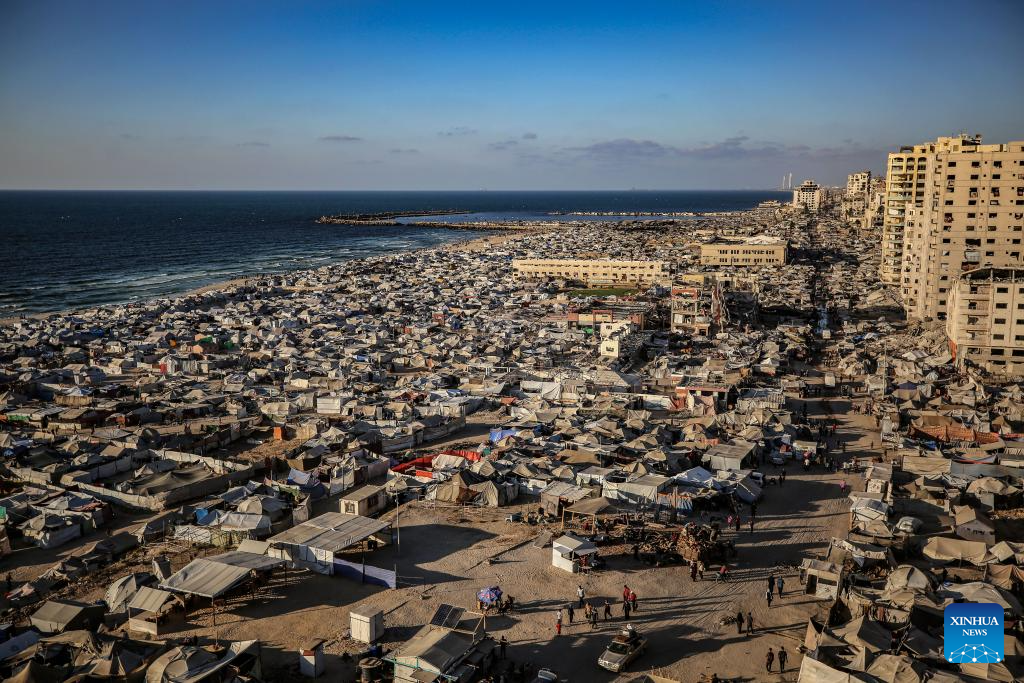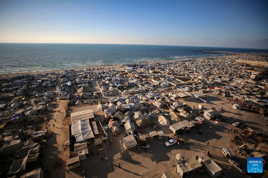 Photo taken on Sept. 1, 2025 shows tents for displaced Palestinians on al-Rasheed Street in Gaza City. (Photo by Rizek Abdeljawad/Xinhua)
