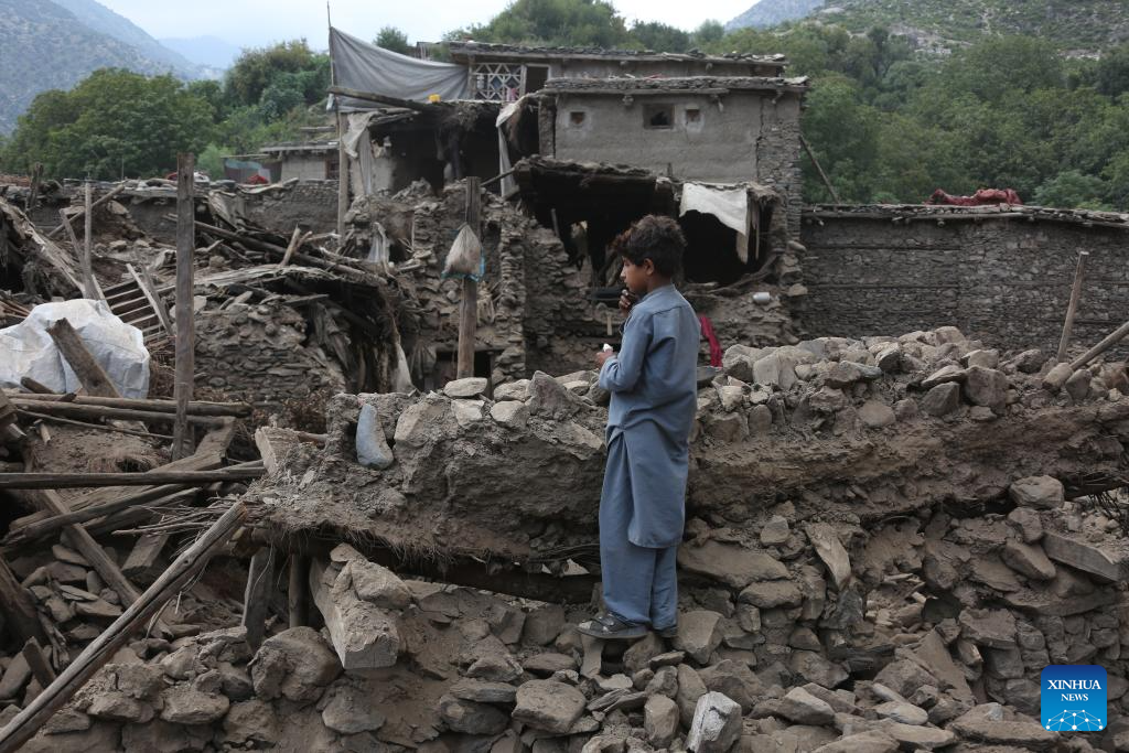 A boy stands on ruins at the earthquake-hit area in Nurgal district of Kunar province, Afghanistan, Sept. 1, 2025. The death toll from the powerful earthquake that struck eastern Afghanistan has climbed to 1,124, with 3,251 others injured, according to the Afghan Red Crescent Society on Tuesday. (Photo by Saifurahman Safi/Xinhua)