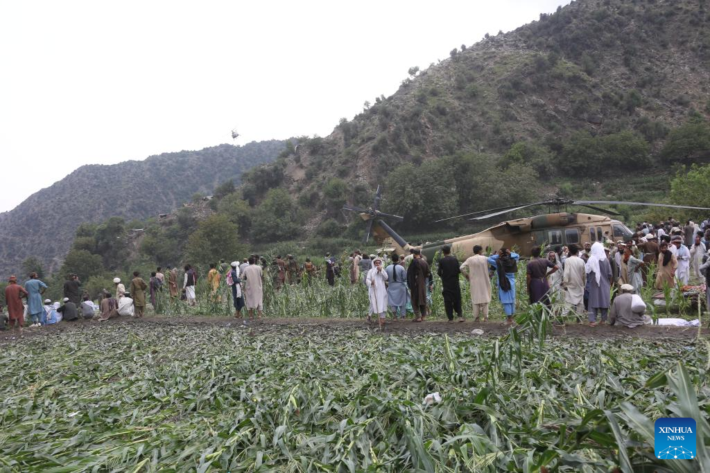 People gather around a rescue helicopter at the earthquake-hit area in Nurgal district of Kunar province, Afghanistan, Sept. 1, 2025. The death toll from the powerful earthquake that struck eastern Afghanistan has climbed to 1,124, with 3,251 others injured, according to the Afghan Red Crescent Society on Tuesday. (Photo by Saifurahman Safi/Xinhua)