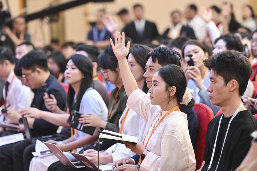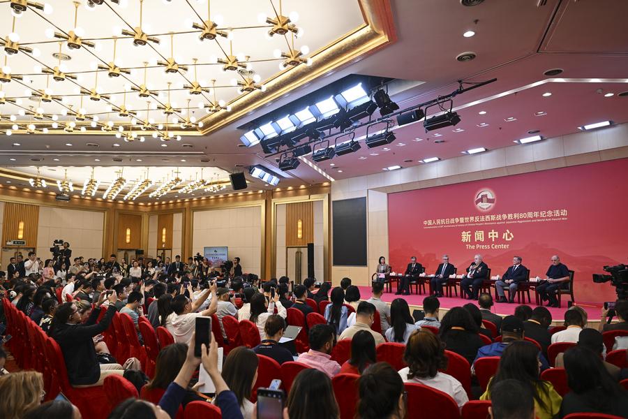 The press center for the events commemorating the 80th anniversary of the victory in the Chinese People's War of Resistance Against Japanese Aggression and the World Anti-Fascist War holds a group interview in Beijing, capital of China, Sept. 2, 2025. (Xinhua/Jin Liangkuai)