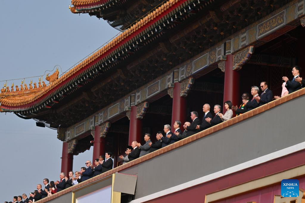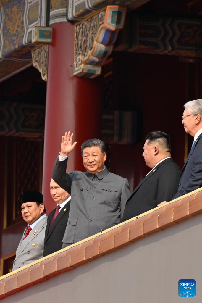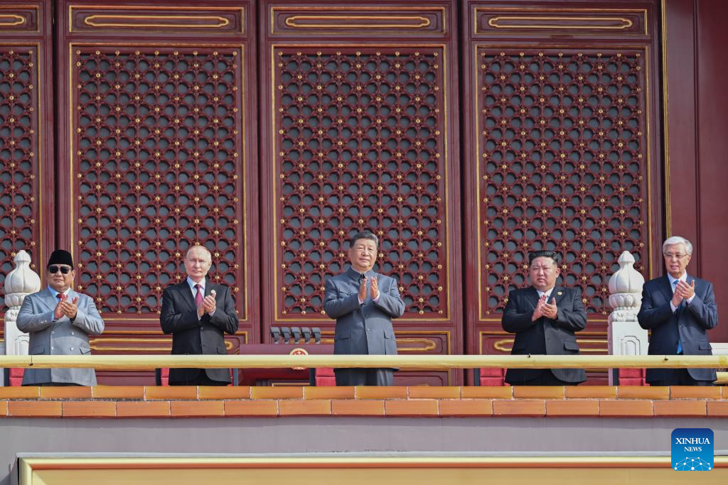 Chinese President Xi Jinping, also general secretary of the Communist Party of China Central Committee and chairman of the Central Military Commission, attends a grand gathering to commemorate the 80th anniversary of the victory in the Chinese People's War of Resistance against Japanese Aggression and the World Anti-Fascist War, along with other foreign leaders on Tian'anmen Rostrum in Beijing, capital of China, Sept. 3, 2025. (Xinhua/Rao Aimin)