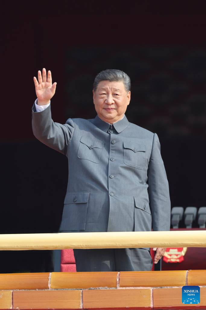 Chinese President Xi Jinping, also general secretary of the Communist Party of China Central Committee and chairman of the Central Military Commission, waves at Tian'anmen Rostrum in Beijing, capital of China, Sept. 3, 2025. China on Wednesday held a grand gathering to commemorate the 80th anniversary of the victory in the Chinese People's War of Resistance against Japanese Aggression and the World Anti-Fascist War. (Xinhua/Ding Haitao)