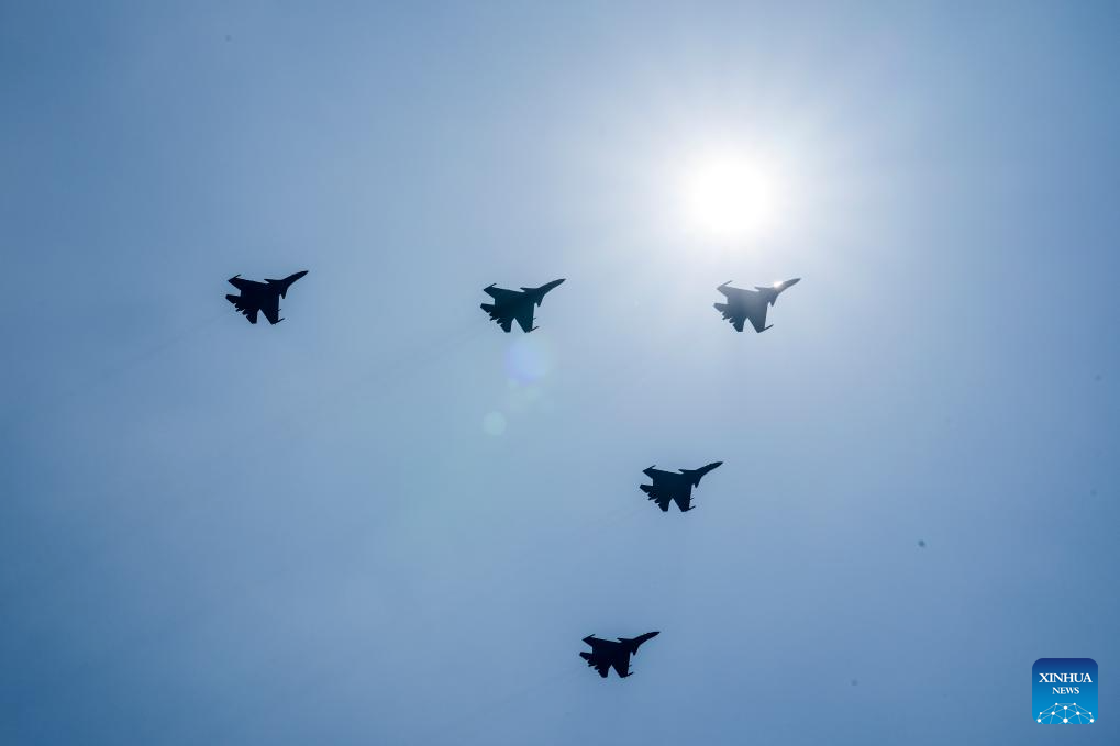 The echelon of aircraft carrier-based fighter jets attends a military parade in Beijing, capital of China, Sept. 3, 2025. China on Wednesday held a grand gathering to commemorate the 80th anniversary of the victory in the Chinese People's War of Resistance against Japanese Aggression and the World Anti-Fascist War. (Xinhua/Li An)
