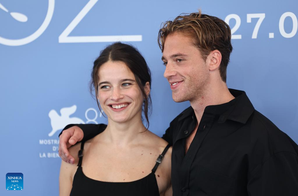 Benjamin Voisin (R) and Rebecca Marder of the film "L'Etranger" pose for the photocall during the 82nd Venice Film Festival in Venice, Italy, Sept. 2, 2025. (Xinhua/Li Jing)