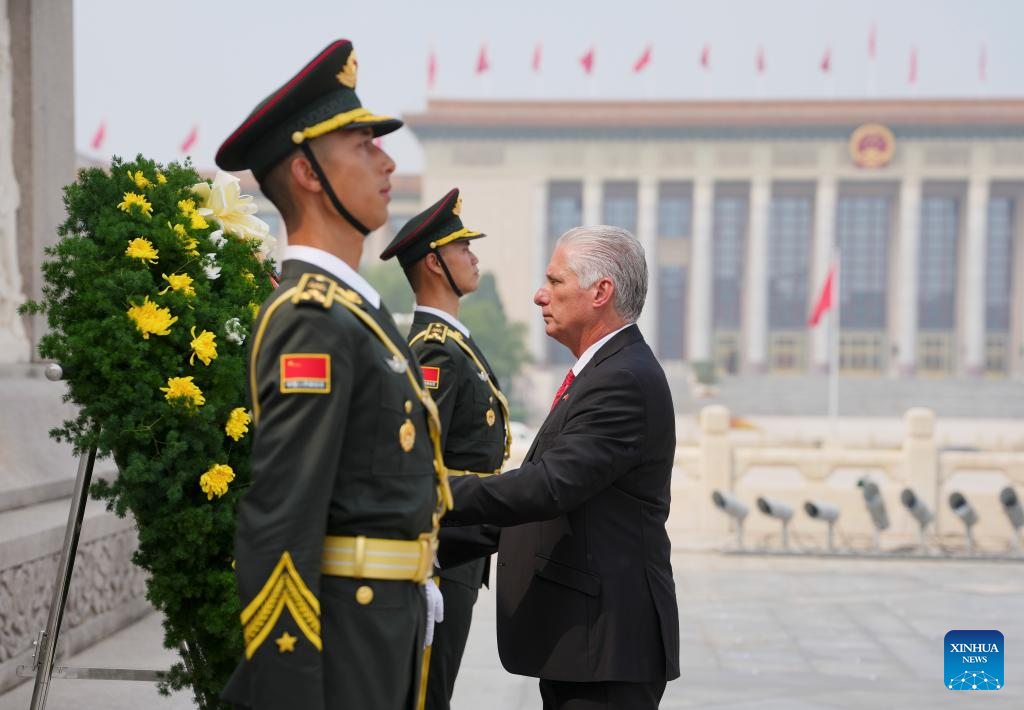 Miguel Diaz-Canel, first secretary of the Central Committee of the Communist Party of Cuba and Cuban president, lays a wreath at the Monument to the People's Heroes on Tian'anmen Square in Beijing, capital of China, Sept. 4, 2025. (Xinhua/Cai Yang)