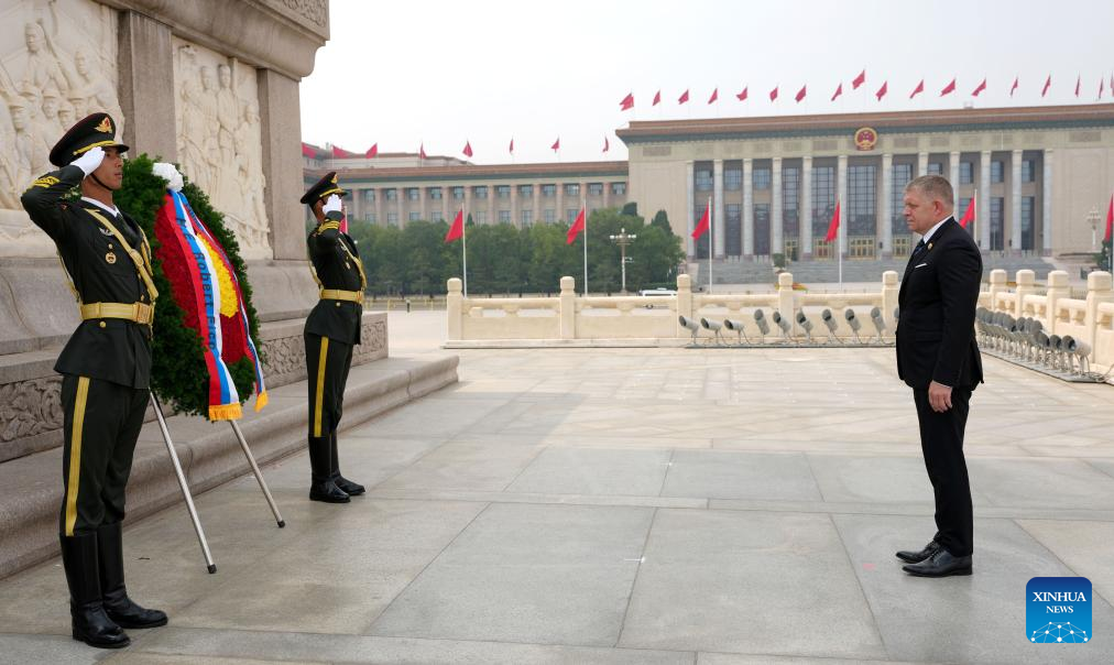 Slovak Prime Minister Robert Fico lays a wreath at the Monument to the People's Heroes on Tian'anmen Square in Beijing, capital of China, Sept. 4, 2025. (Xinhua/Cai Yang)
