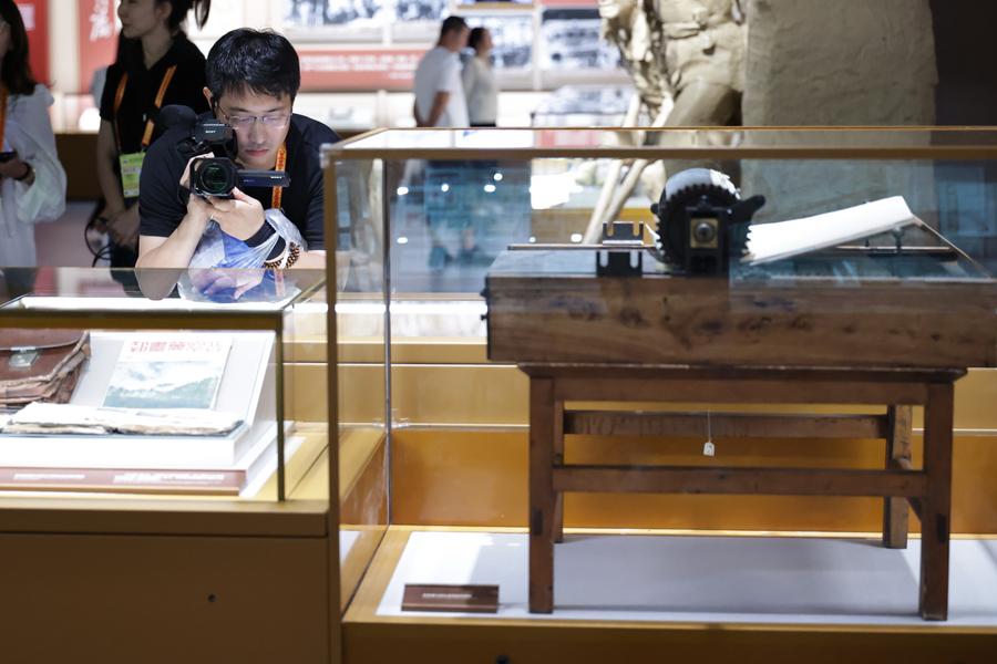 A journalist takes pictures during the visit to the Museum of the War of Chinese People's Resistance Against Japanese Aggression in Beijing, capital of China, Aug. 27, 2025. (Xinhua/Zhang Yuwei)