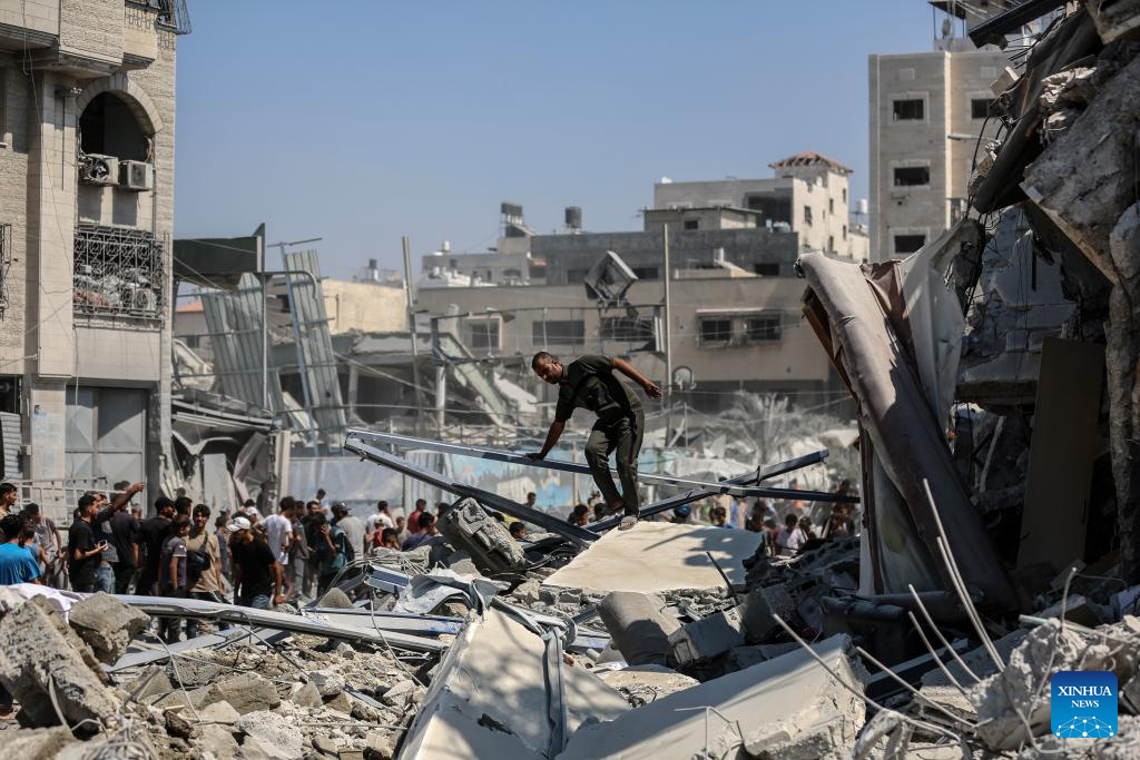 Palestinians inspect the ruins of a residential building following an Israeli airstrike in Gaza City, Sept. 5, 2025. Hamas on Friday denounced the Israeli airstrike on a residential building in Gaza City and accused Israel of seeking to forcibly displace civilians in the Gaza Strip. (Photo by Rizek Abdeljawad/Xinhua)