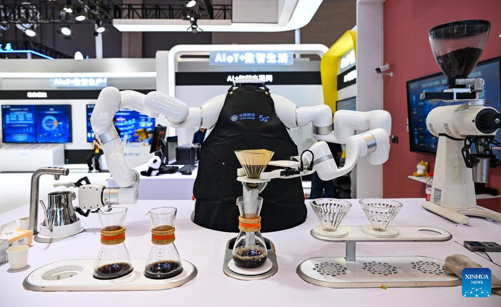 A robot brews coffee during the World Smart Industry Expo 2025 in southwest China's Chongqing, Sept. 5, 2025. The World Smart Industry Expo 2025 kicked off on Friday in southwest China's Chongqing Municipality, bringing together more than 600 domestic and international businesses to showcase innovations across various sectors, including autonomous driving, smart homes and the low-altitude economy. (Xinhua/Wang Quanchao)