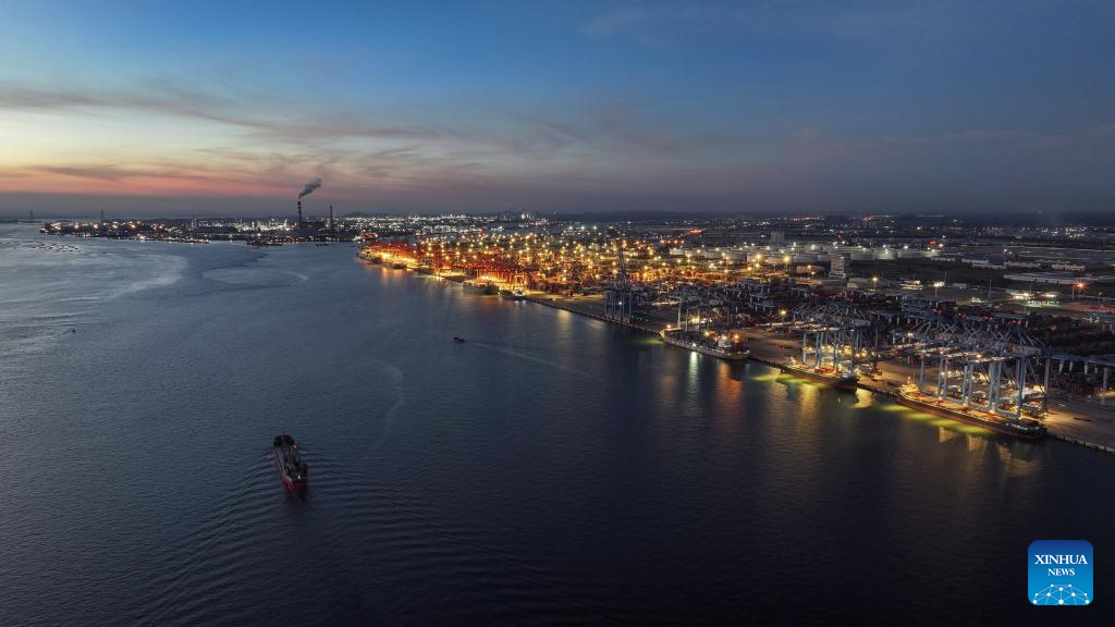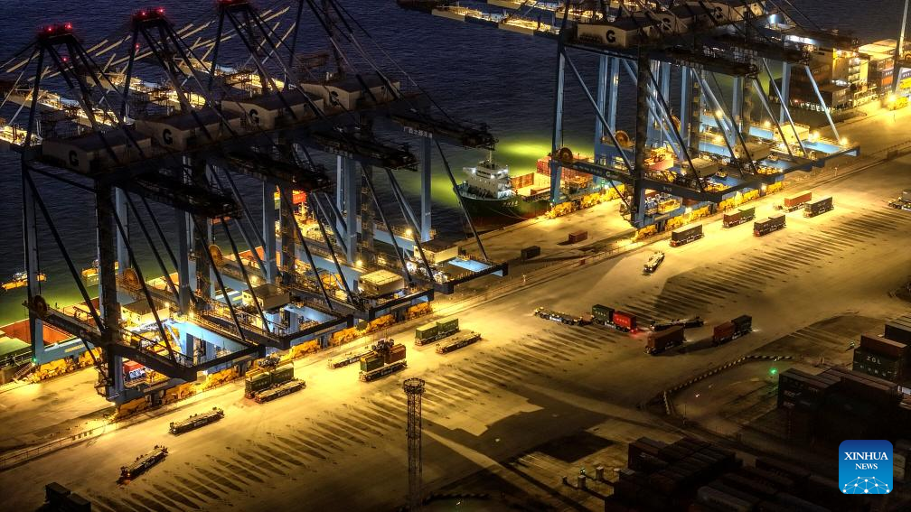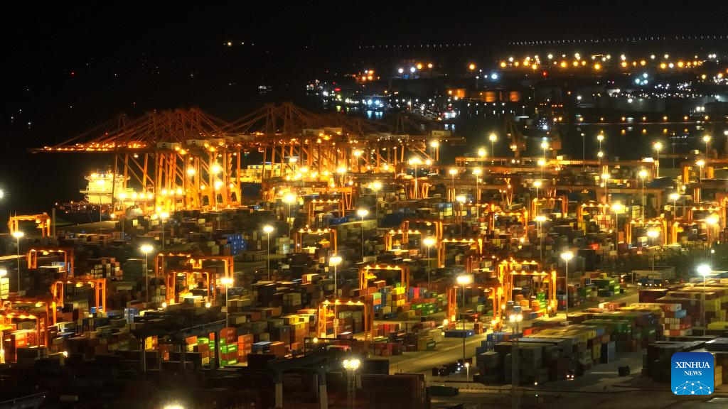 An aerial drone photo taken on Sept. 4, 2025 shows cargo ships berthed at a container dock of Qinzhou Port in Qinzhou City, south China's Guangxi Zhuang Autonomous Region.