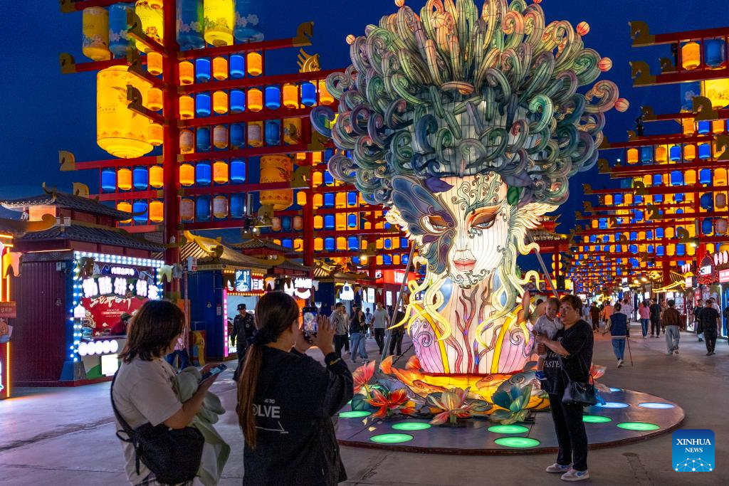 Tourists take photos in front of a lantern at a theme block in Ulanqab, north China's Inner Mongolia Autonomous Region, on Sept. 4, 2025.