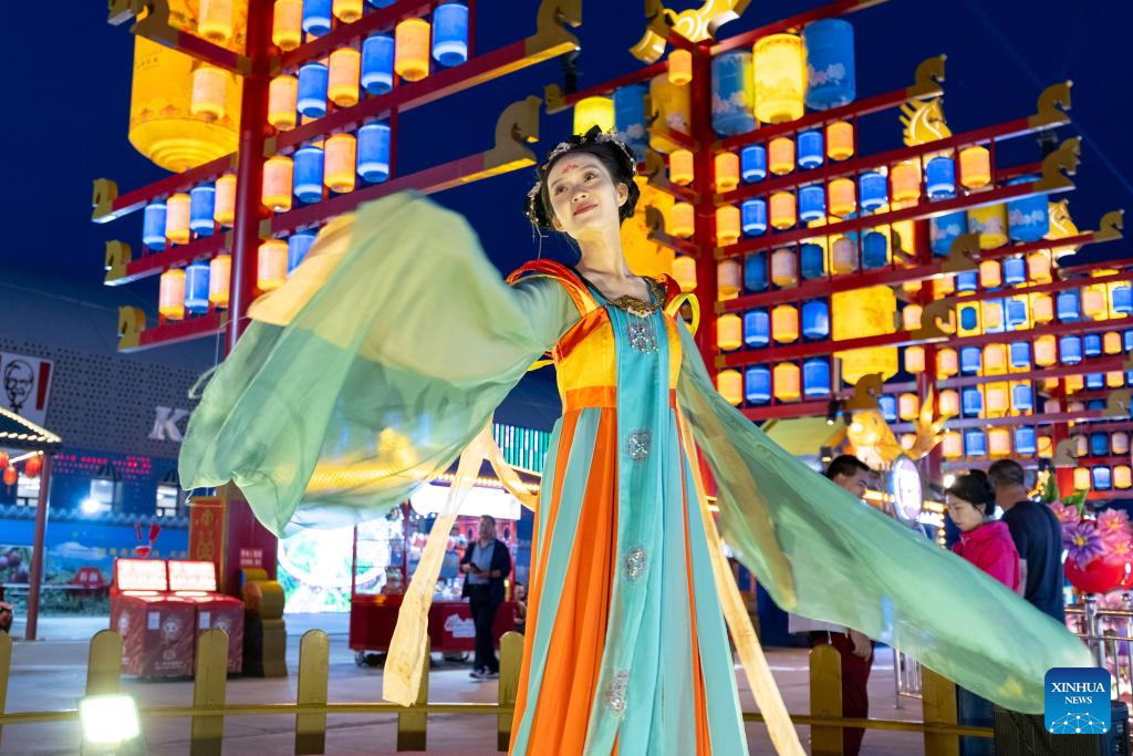 An actress performs a dance at a theme block in Ulanqab, north China's Inner Mongolia Autonomous Region, on Sept. 4, 2025.