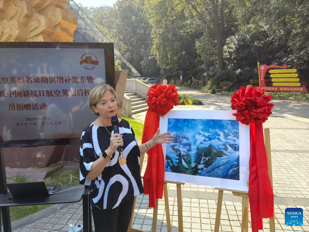This mobile phone photo taken on Sept. 5, 2025 shows Nell Chennault Calloway, granddaughter of Claire Lee Chennault, introducing a donated oil painting at the Nanjing Anti-Japanese Aviation Martyrs Memorial Hall in east China's Jiangsu Province, Sept. 5, 2025. (Xinhua/Qiu Bingqing)