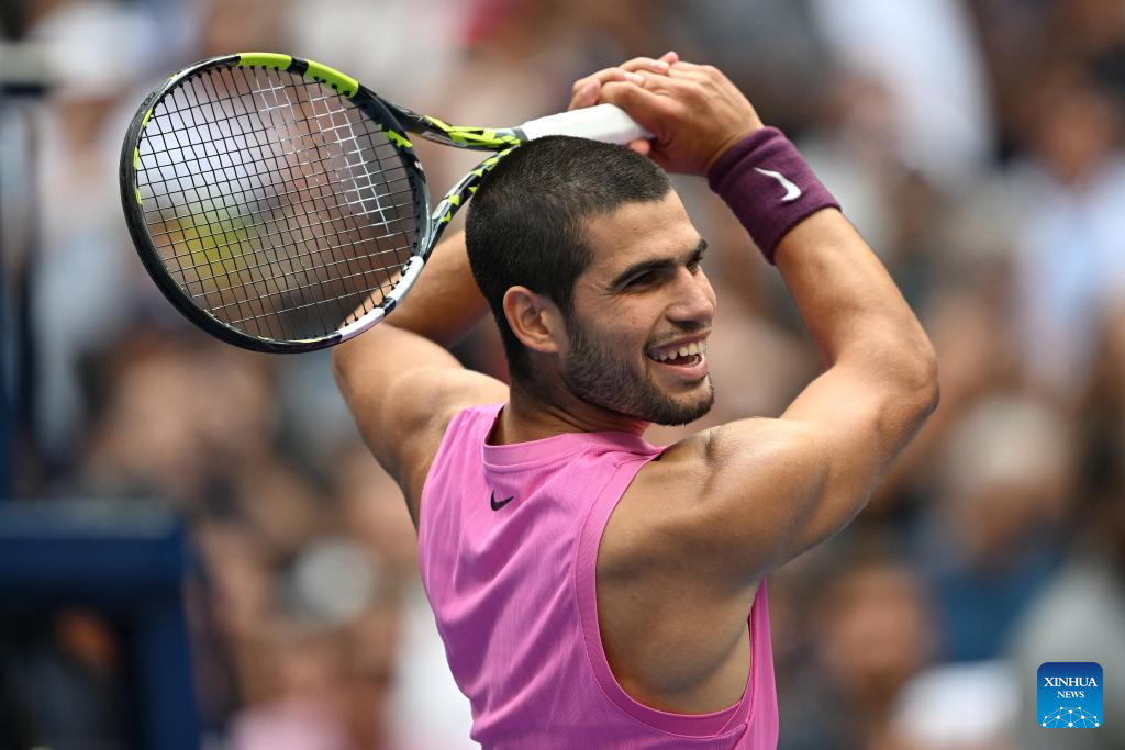 Carlos Alcaraz celebrates after the men's singles semifinal match between Novak Djokovic of Serbia and Carlos Alcaraz of Spain at the 2025 US Open tennis championships in New York, the United States, Sept. 5, 2025. (Xinhua/Li Rui)