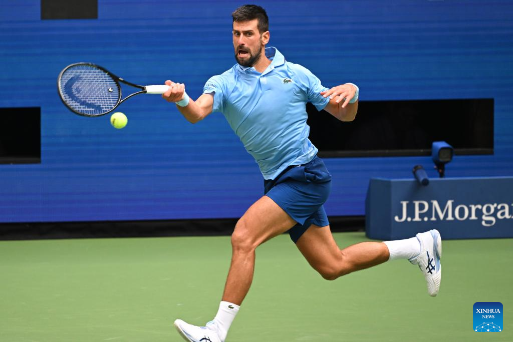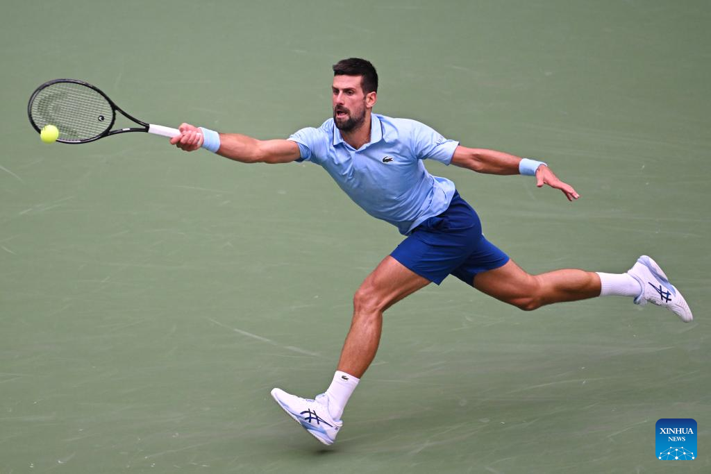 Novak Djokovic hits a return during the men's singles semifinal match between Novak Djokovic of Serbia and Carlos Alcaraz of Spain at the 2025 US Open tennis championships in New York, the United States, Sept. 5, 2025. (Xinhua/Li Rui)