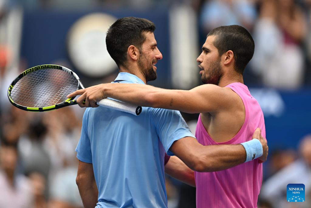 Novak Djokovic greets Carlos Alcaraz (R) after the men's singles semifinal match between Novak Djokovic of Serbia and Carlos Alcaraz of Spain at the 2025 US Open tennis championships in New York, the United States, Sept. 5, 2025. (Xinhua/Li Rui)