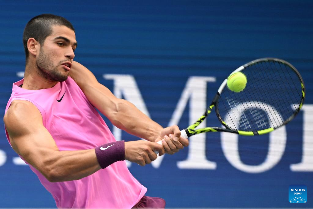 Carlos Alcaraz hits a return during the men's singles semifinal match between Novak Djokovic of Serbia and Carlos Alcaraz of Spain at the 2025 US Open tennis championships in New York, the United States, Sept. 5, 2025. (Xinhua/Li Rui)