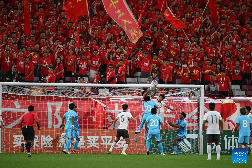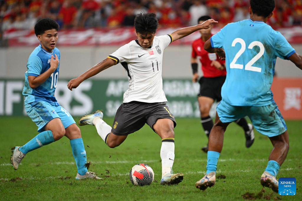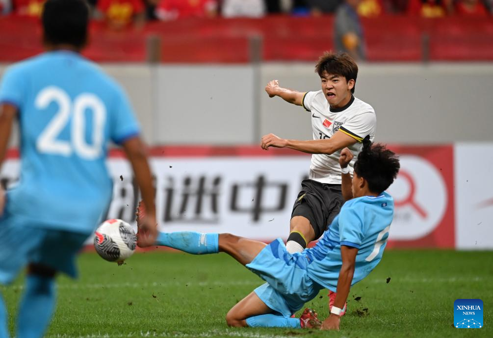 Kuai Jiwen (C) of China shoots during the AFC U23 Asian Cup Qualifiers Group D football match between China and the Northern Mariana Islands in Xi'an, northwest China's Shaanxi Province, Sept. 6, 2025. (Xinhua/Zou Jingyi)