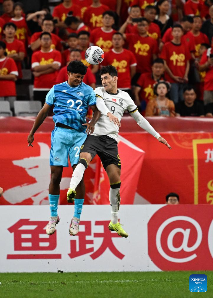 Baihelamu Abuduwaili (R) of China vies with Aloyzeus Angeles of the Northern Mariana Islands during the AFC U23 Asian Cup Qualifiers Group D football match between China and the Northern Mariana Islands in Xi'an, northwest China's Shaanxi Province, Sept. 6, 2025. (Xinhua/Zou Jingyi)