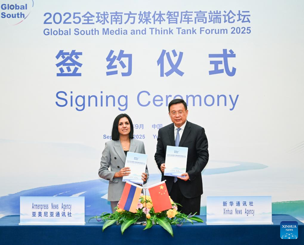 President of Xinhua News Agency Fu Hua attends an agreement exchange ceremony with Narine Nazaryan, director of the Armenian state news agency Armenpress in Kunming, southwest China's Yunnan Province, Sept. 5, 2025. Xinhua News Agency on Friday held a cooperation agreement exchange ceremony with the Media Development Agency of Azerbaijan, and another with the Armenian state news agency Armenpress, aiming to deepen cooperation on news and information exchange, personnel visits and training. (Xinhua/Zhang Ling)