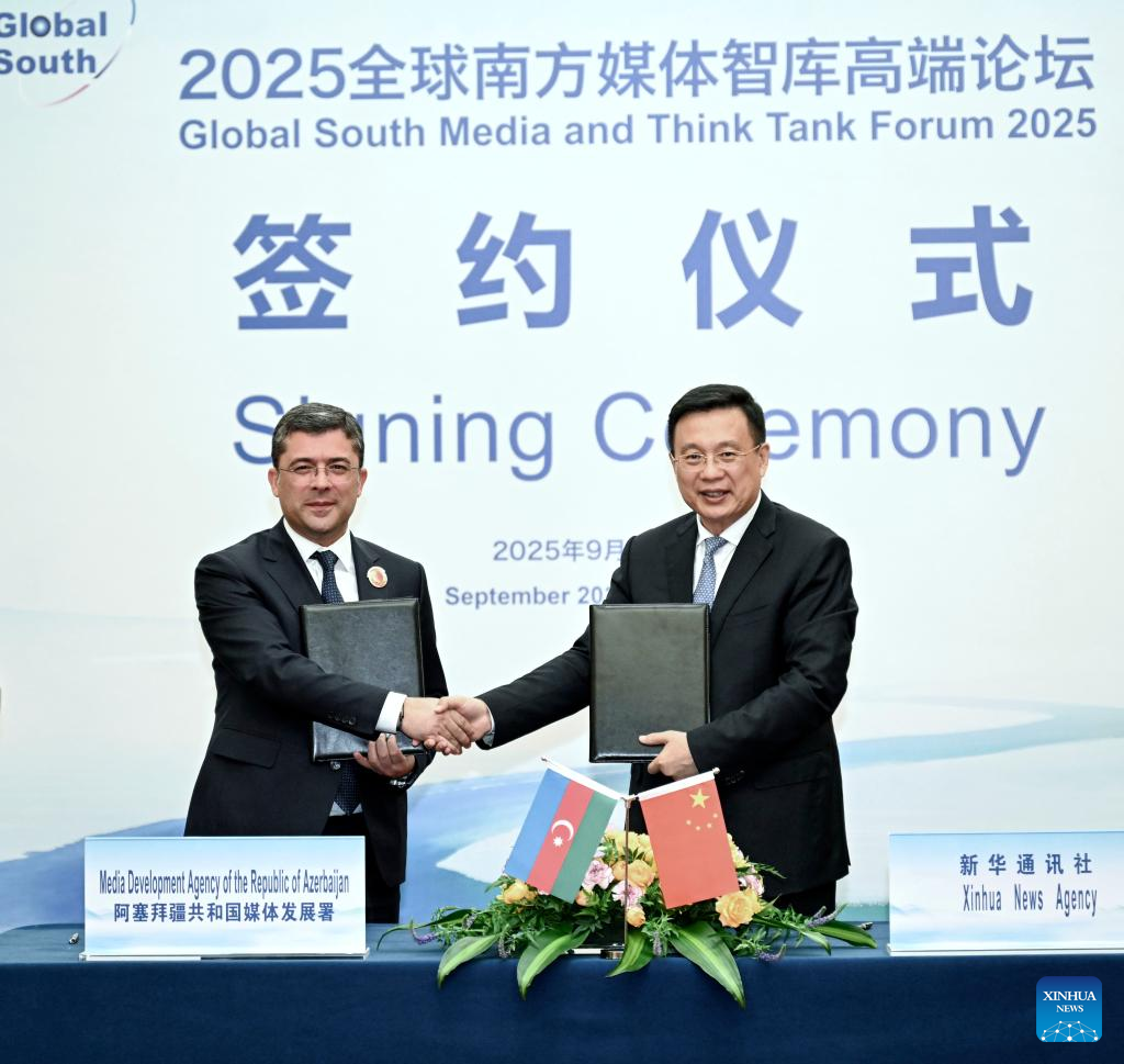 President of Xinhua News Agency Fu Hua attends an agreement exchange ceremony with Ahmad Ismayilov, executive director of the Media Development Agency of Azerbaijan in Kunming, southwest China's Yunnan Province, Sept. 5, 2025. Xinhua News Agency on Friday held a cooperation agreement exchange ceremony with the Media Development Agency of Azerbaijan, and another with the Armenian state news agency Armenpress, aiming to deepen cooperation on news and information exchange, personnel visits and training. (Xinhua/Zhang Ling)