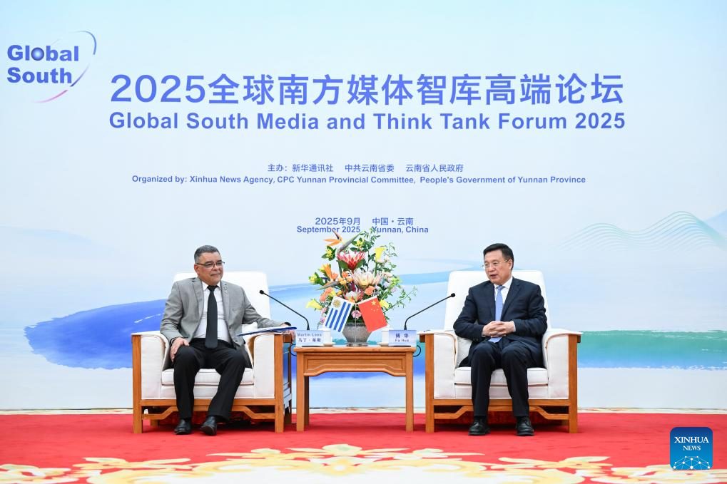 President of Xinhua News Agency Fu Hua meets with Martin Alejandro Lees Lima, director of the information bureau of the presidential palace of Uruguay, who is in China for the Global South Media and Think Tank Forum 2025, in Kunming, southwest China's Yunnan Province, Sept. 5, 2025. (Xinhua/Zhang Ling)