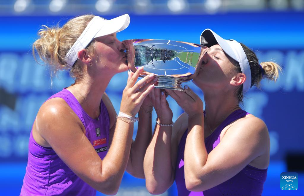 Gabriela Dabrowski (R)/Erin Routliffe kiss the trophy during the victory ceremony for the women's doubles final match between Gabriela Dabrowski of Canada/Erin Routliffe of New Zealand and Katerina Siniakova of the Czech Republic/Taylor Townsend of the United States at the 2025 US Open tennis championships in New York, the United States, Sept. 5, 2025. (Xinhua/Wu Xiaoling)