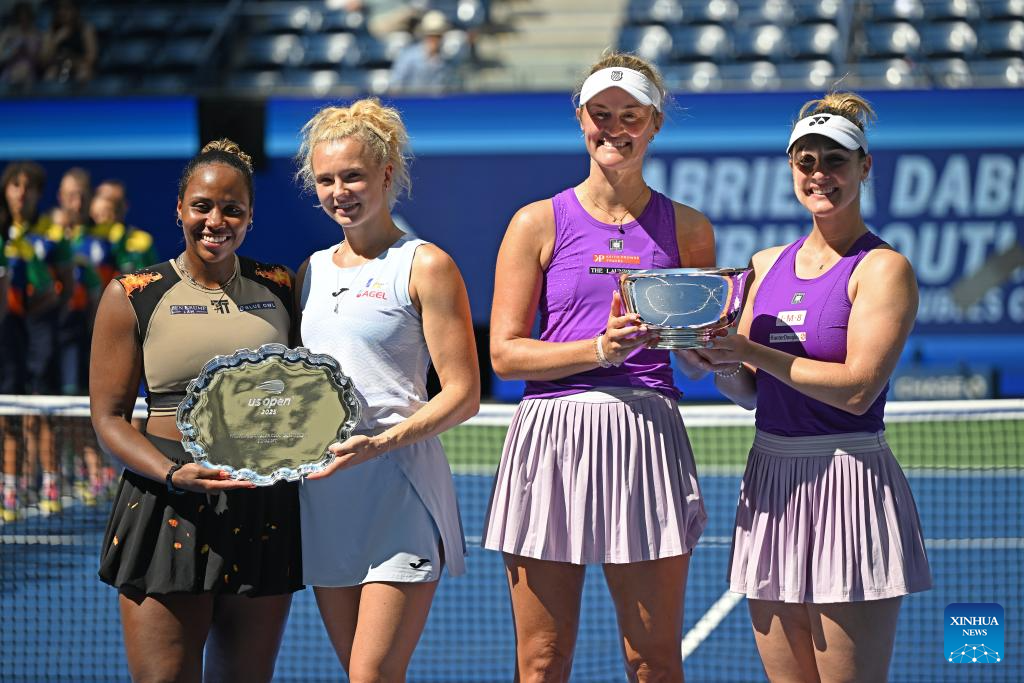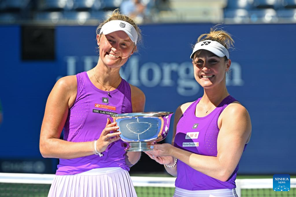 Gabriela Dabrowski (R)/Erin Routliffe pose for photos during the victory ceremony for the women's doubles final match between Gabriela Dabrowski of Canada/Erin Routliffe of New Zealand and Katerina Siniakova of the Czech Republic/Taylor Townsend of the United States at the 2025 US Open tennis championships in New York, the United States, Sept. 5, 2025. (Xinhua/Li Rui)