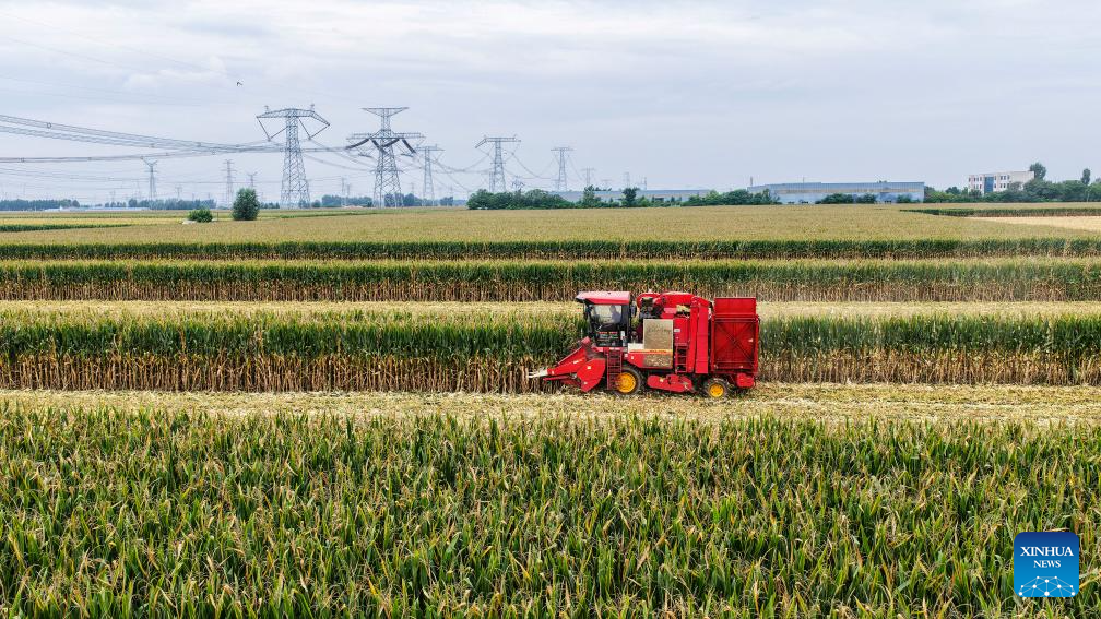 An aerial drone photo taken on Sept. 5, 2025 shows a farmer harvesting corns with a reaper in a field in Linjian Town, Linyi City of east China's Shandong Province. White Dew, a solar term meaning dew curdles and it starts to get cold, falls on Sept. 7 this year. (Photo by Wu Jiquan/Xinhua)