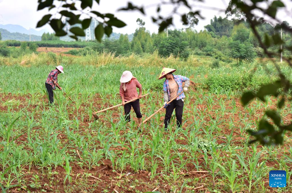 Farmers weed in a field in Dajing Village, Hezhou City of south China's Guangxi Zhuang Autonomous Region, Sept. 5, 2025. White Dew, a solar term meaning dew curdles and it starts to get cold, falls on Sept. 7 this year. (Photo by Liao Zuping/Xinhua)
