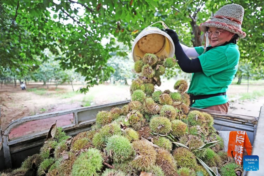 A farmer loads harvested Chinese chestnuts onto a truck in Tancheng County in Linyi City, east China's Shandong Province, Sept. 5, 2025. White Dew, a solar term meaning dew curdles and it starts to get cold, falls on Sept. 7 this year. (Photo by Zhang Chunlei/Xinhua)